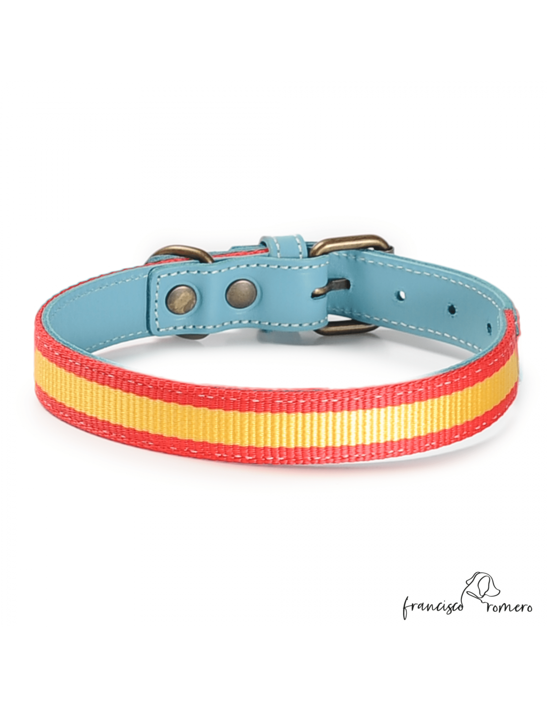 Collar fabricado en Piel Vaquetilla y nylon de Bandera España con hebilla rulo de oro viejo.