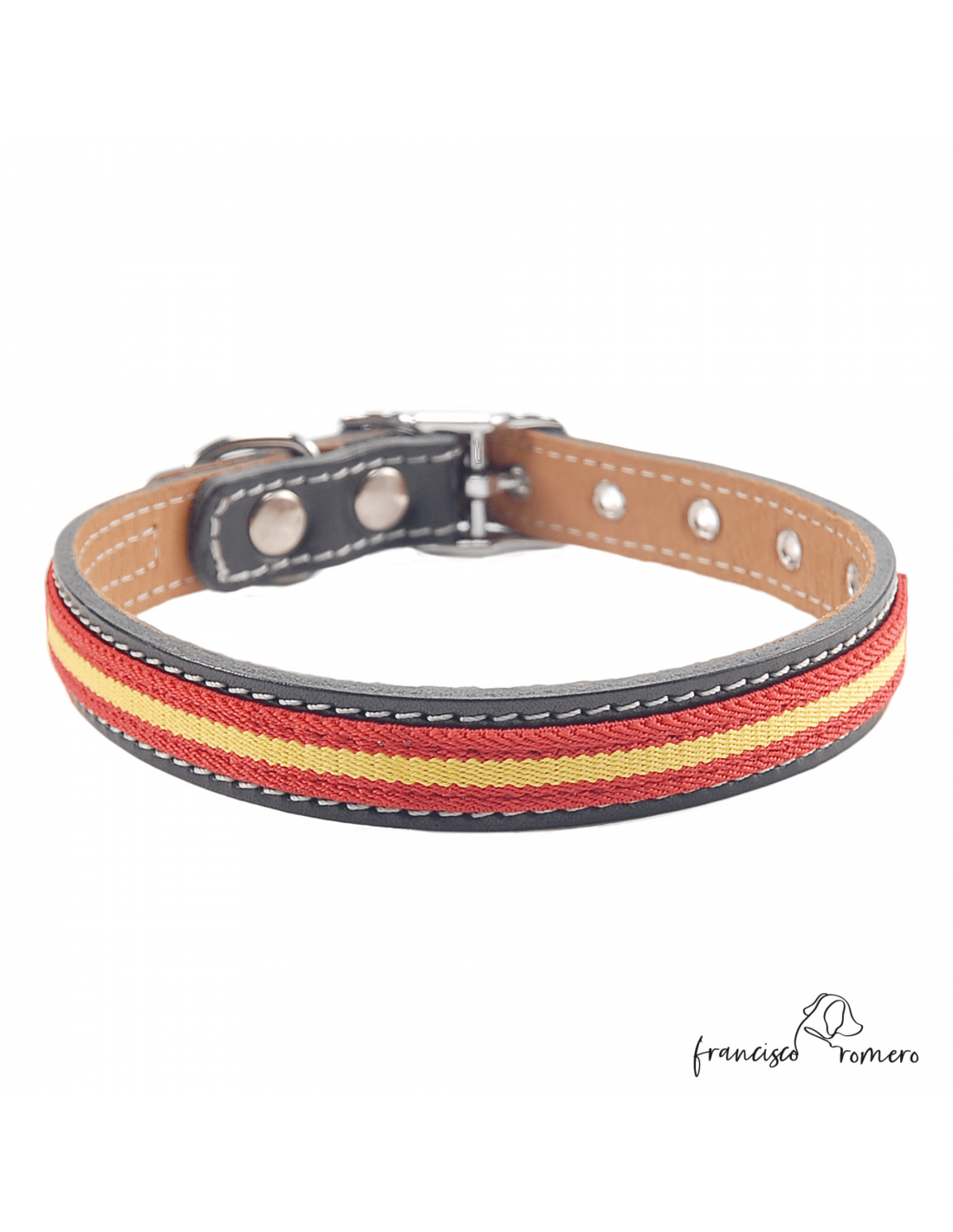 Collar fabricado artesanalmente en doble Piel de vaca con bandera de España y hebilla de níquel.