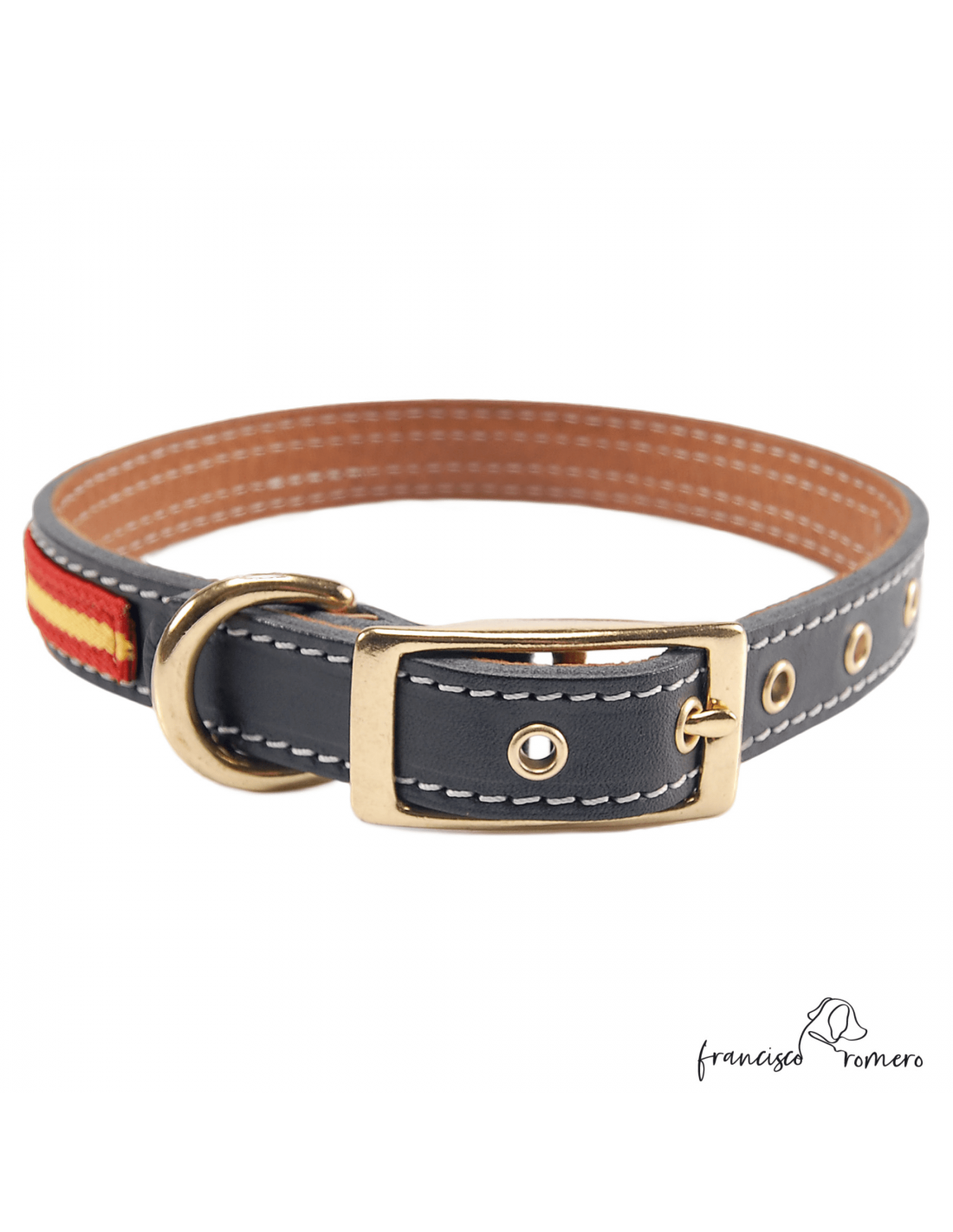 Collar Doble Piel con bandera España y herrajes latón Negro