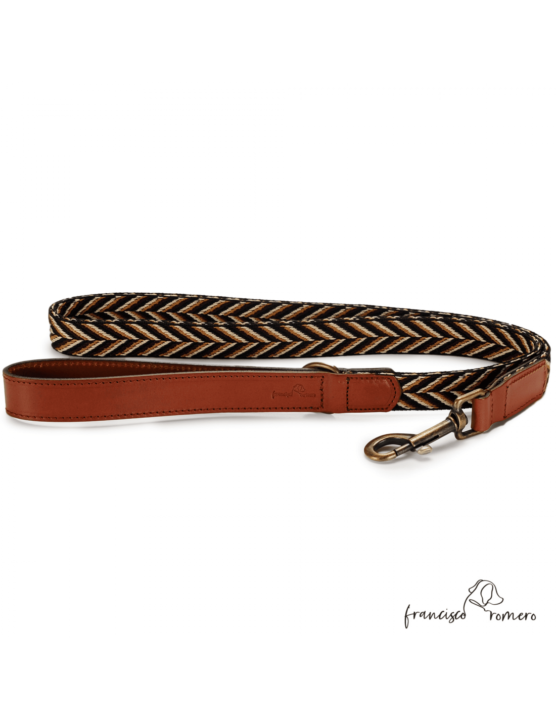 - Correa para perros fabricada en piel natural de primera calidad combinada con una cinta étnica de poliamida de diseño espiga cosida artesanalmente.