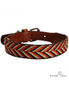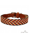 - Amarre para dos perros fabricado en piel natural de primera calidad combinada con una cinta étnica de poliamida de diseño espiga cosida artesanalmente.
