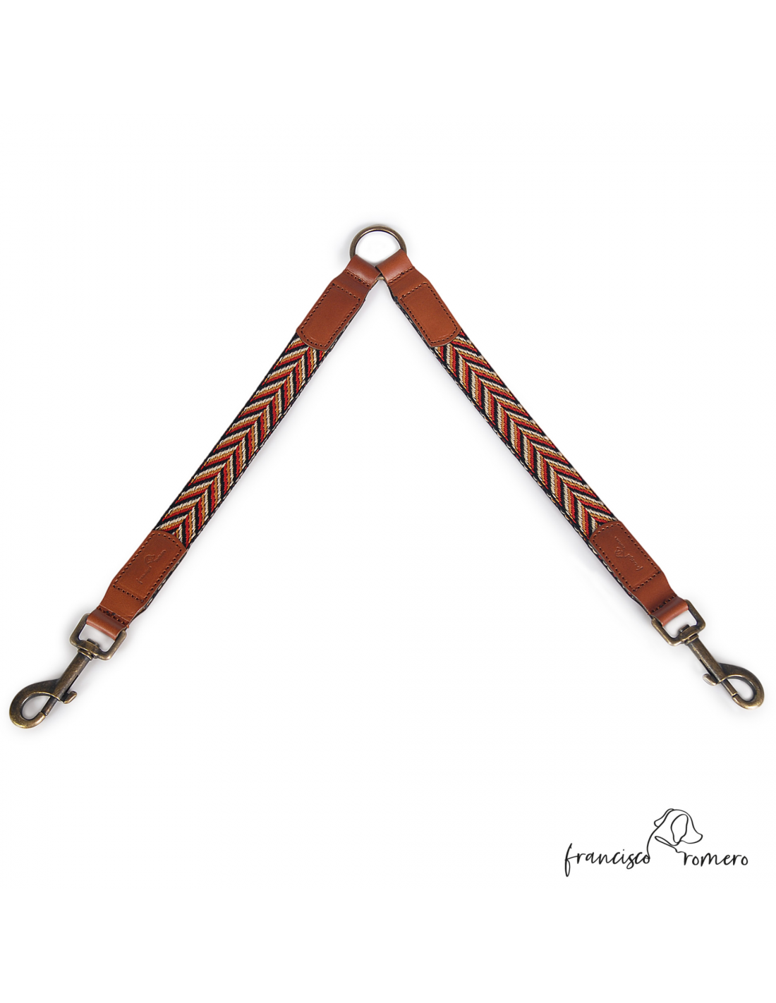 Amarre para dos perros fabricado en piel combinada con una cinta étnica de poliamida.