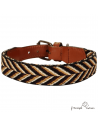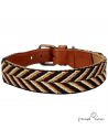 - Amarre para dos perros fabricado en piel natural de primera calidad combinada con una cinta étnica de poliamida de diseño espiga cosida artesanalmente.