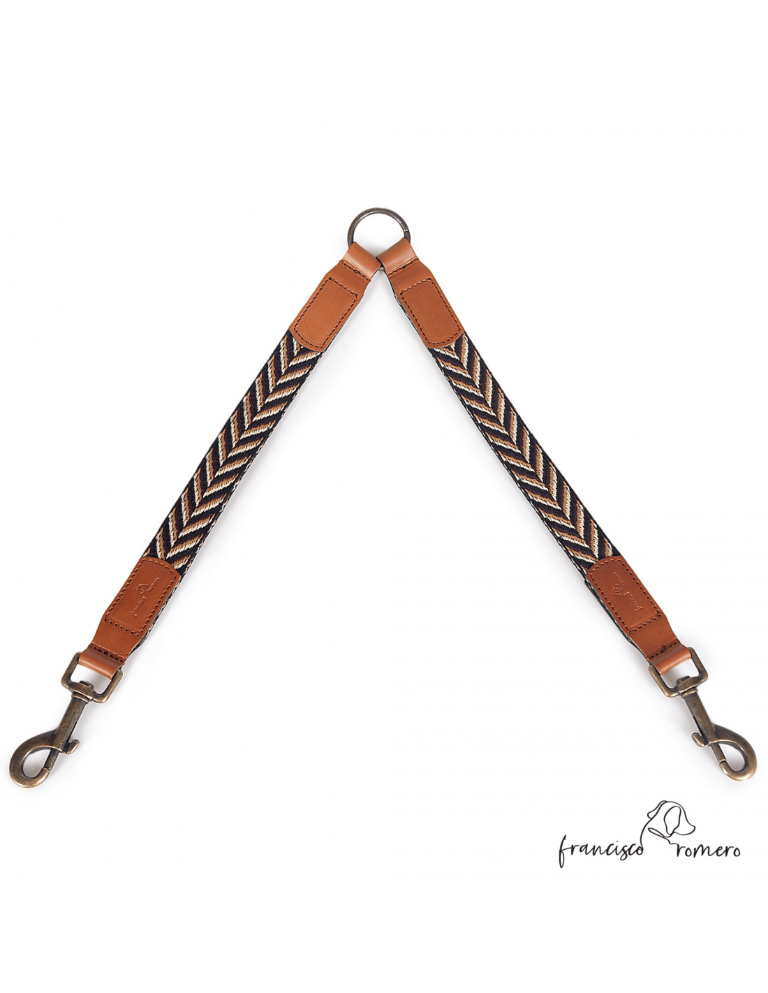 Amarre para dos perros fabricado en piel combinada con una cinta étnica de poliamida.
